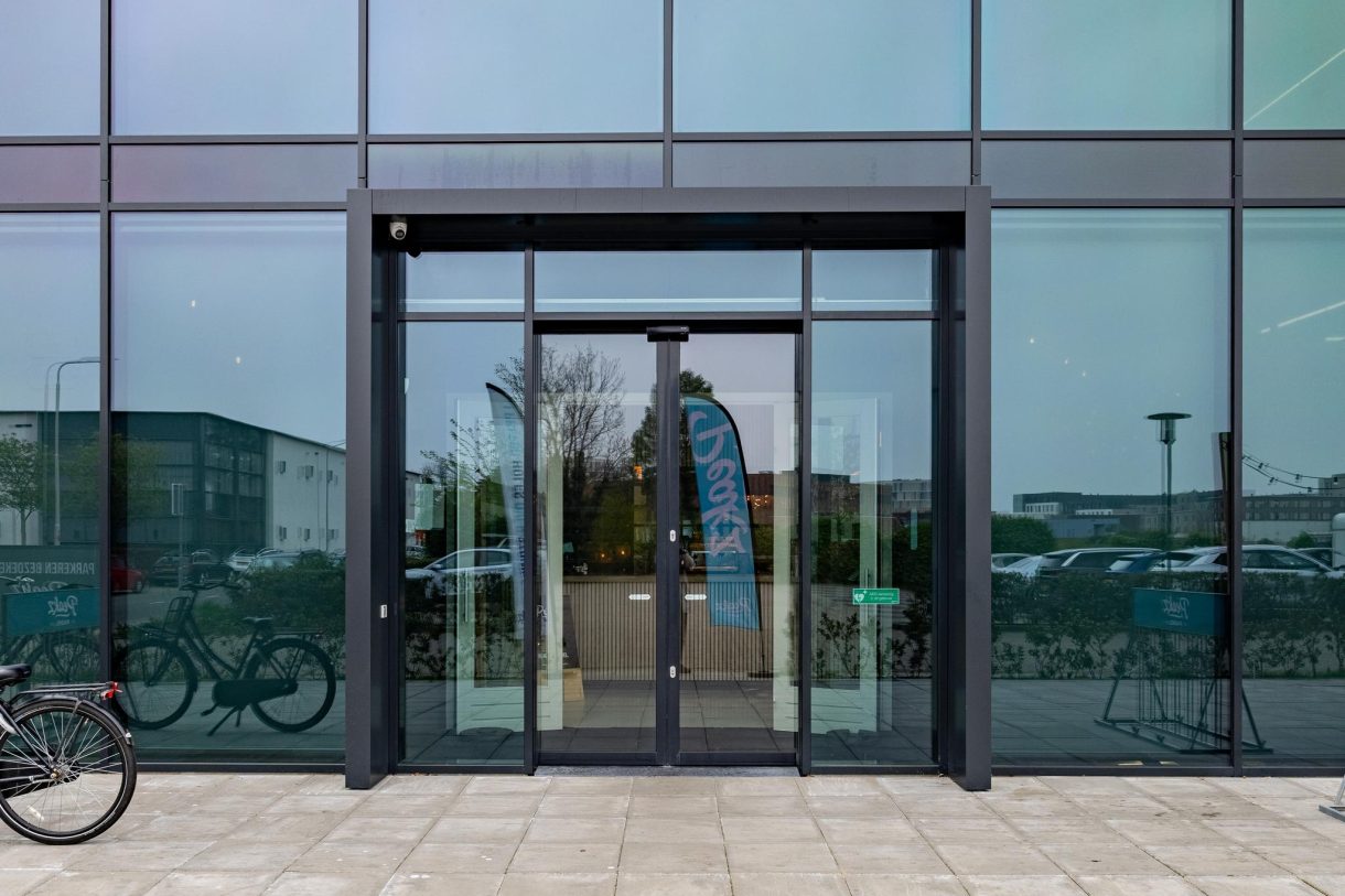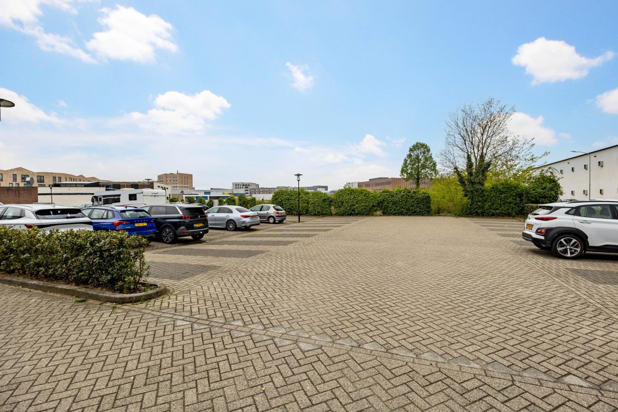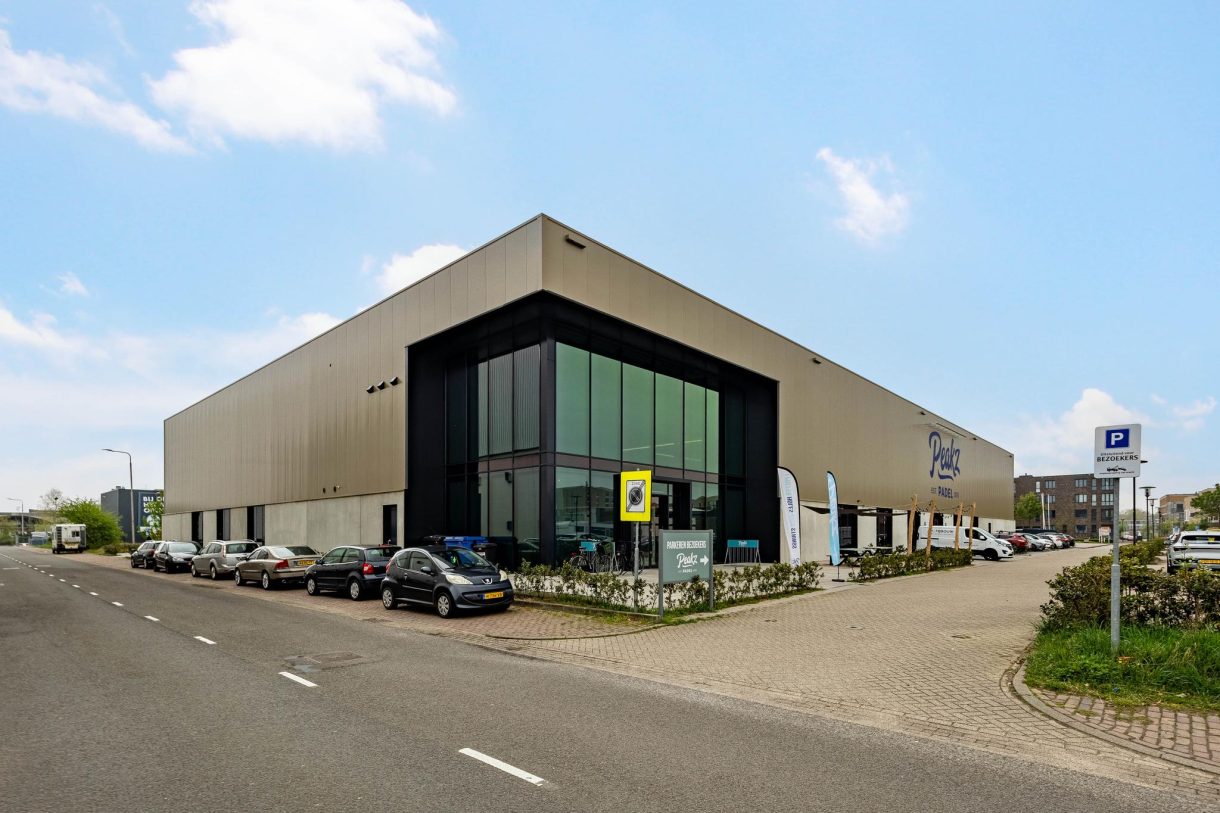 Er is een grote parkeerplaats voor het pand. Beneden is er horecaruimte en speelvelden van het padelcentrum.