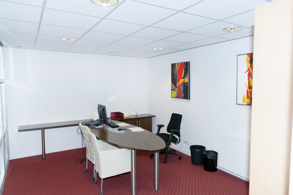 Hierachter zijn twee kantooorkamers, kantine, kamer, gang met dubbele toiletgroep, achteringang en magazijn-berging met c.v.ketel .