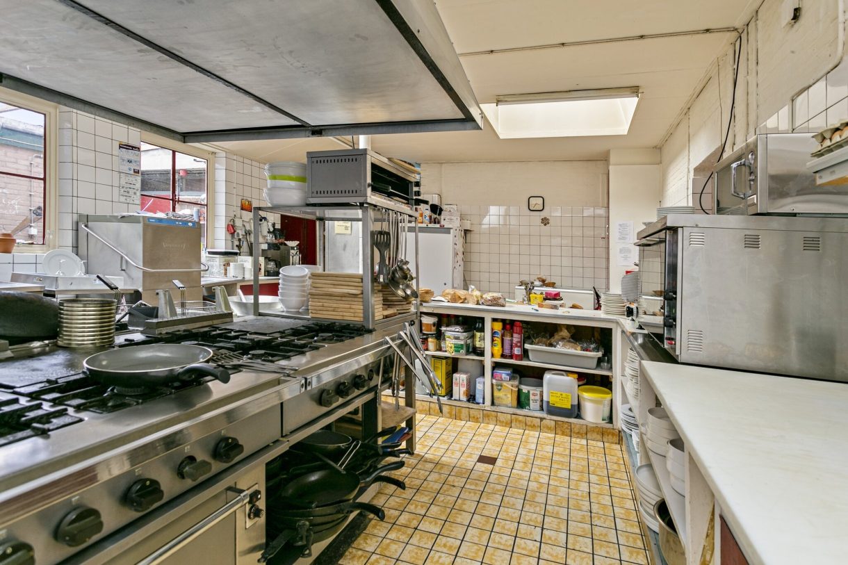 De bedrijfskeuken is qua maatvoering groot genoeg om voor een grote groep mensen een buffet of à la carte eten te bereiden. Achter de keuken is een bijkeuken, ook is vlak naast de keuken de trap naar de stahoge kelder. Aan de andere kant, bij het café, is een kantoorruimte.
