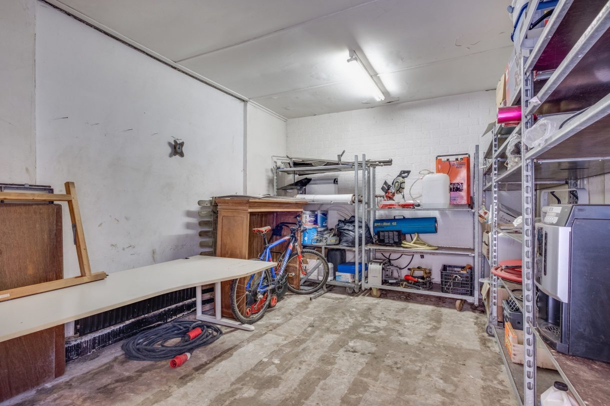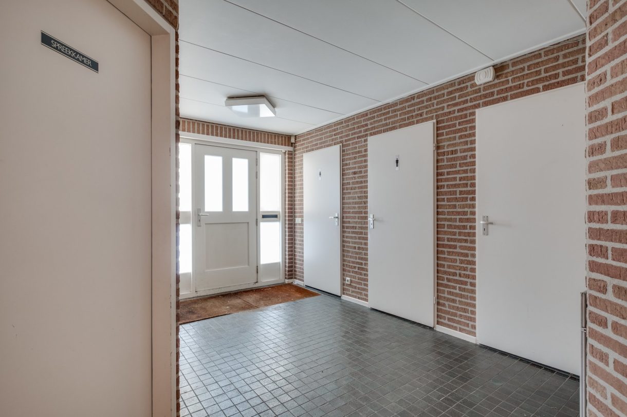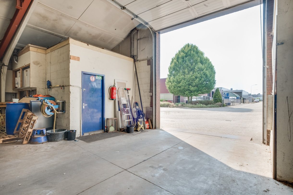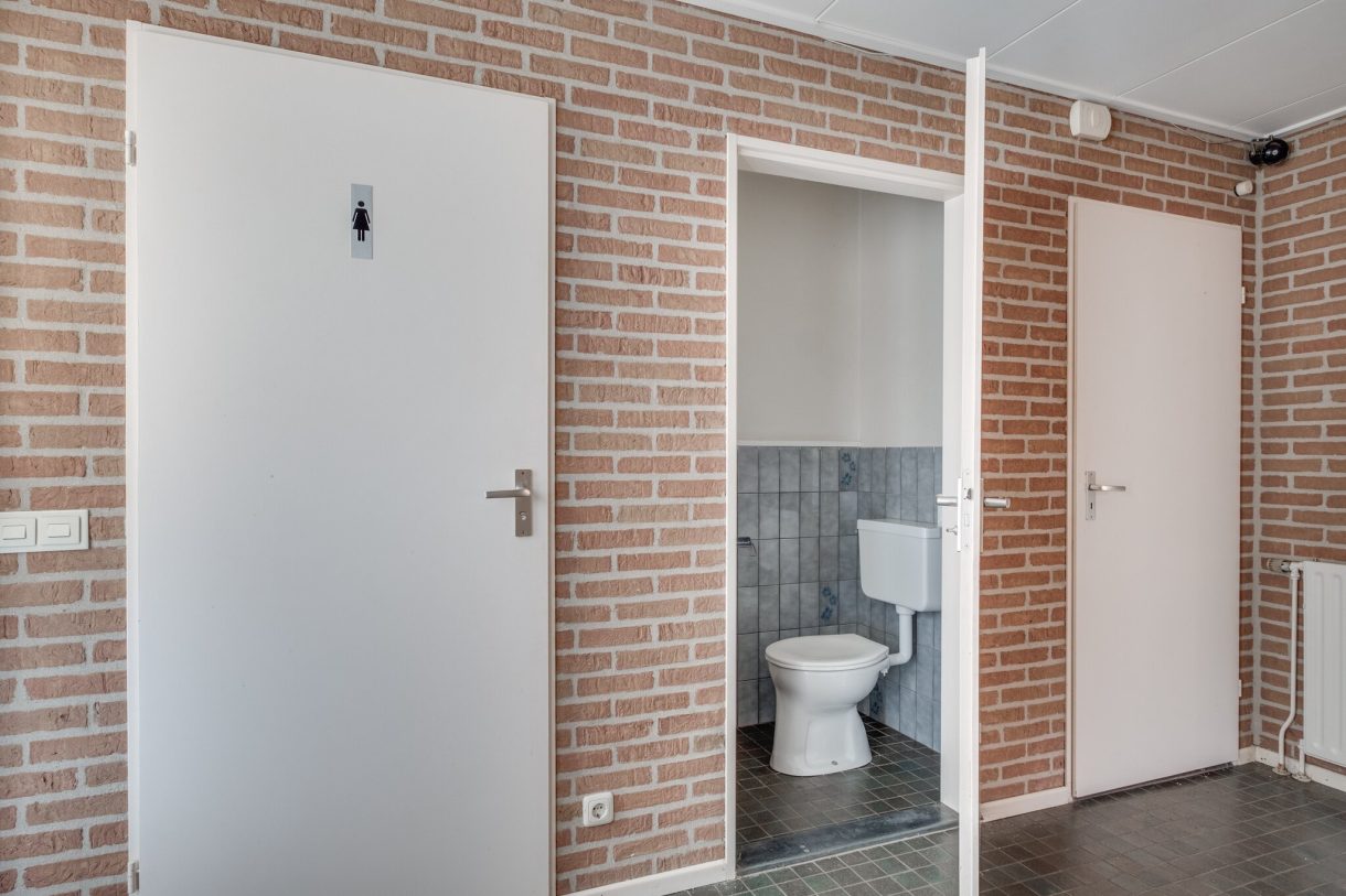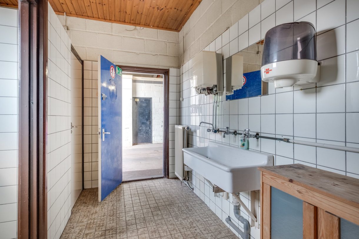 Entree aan straatzijde met loop- en overheaddeur, koelcel (optioneel), toiletgroep met douche, twee urinoirs en wastafel.