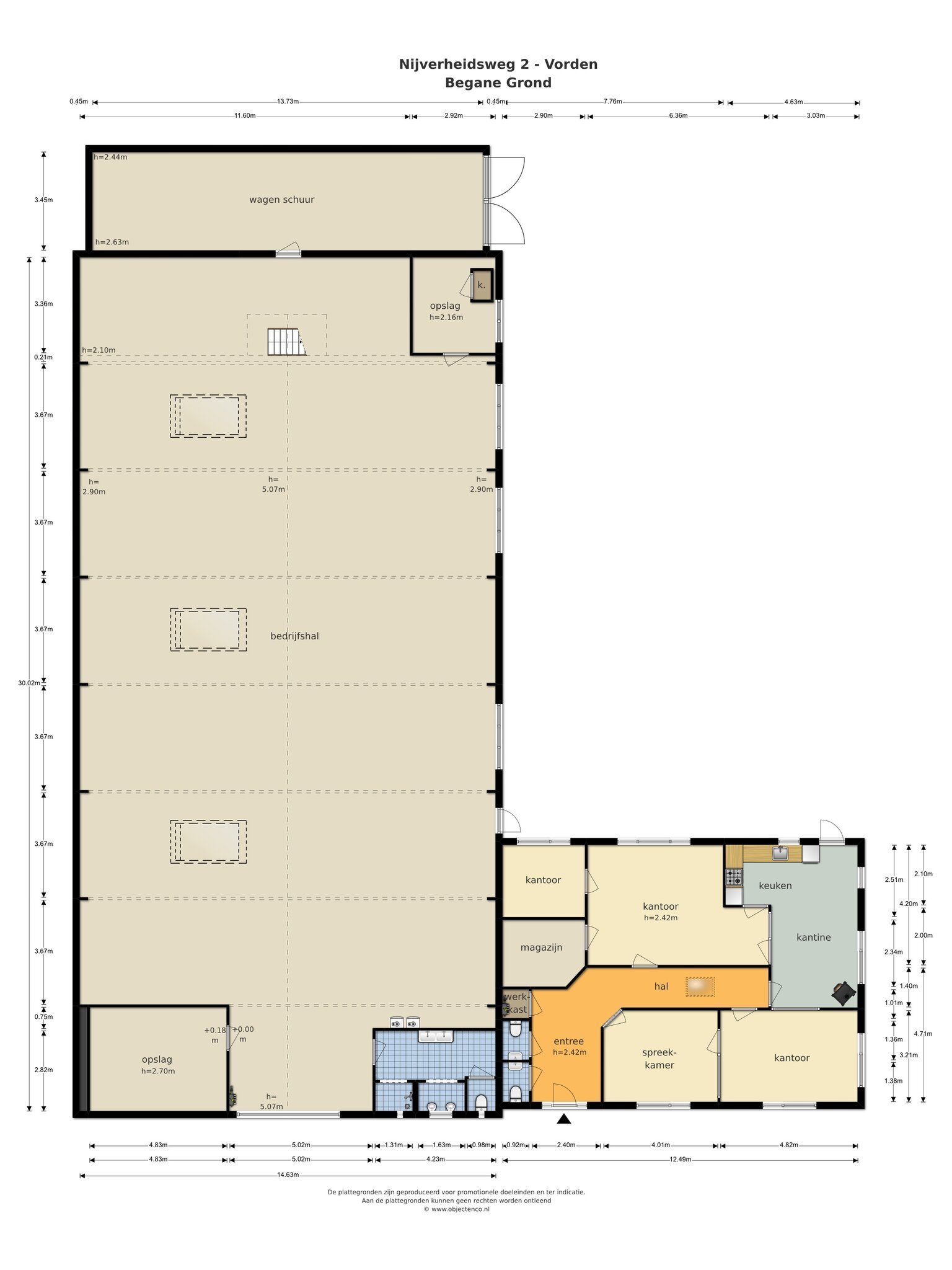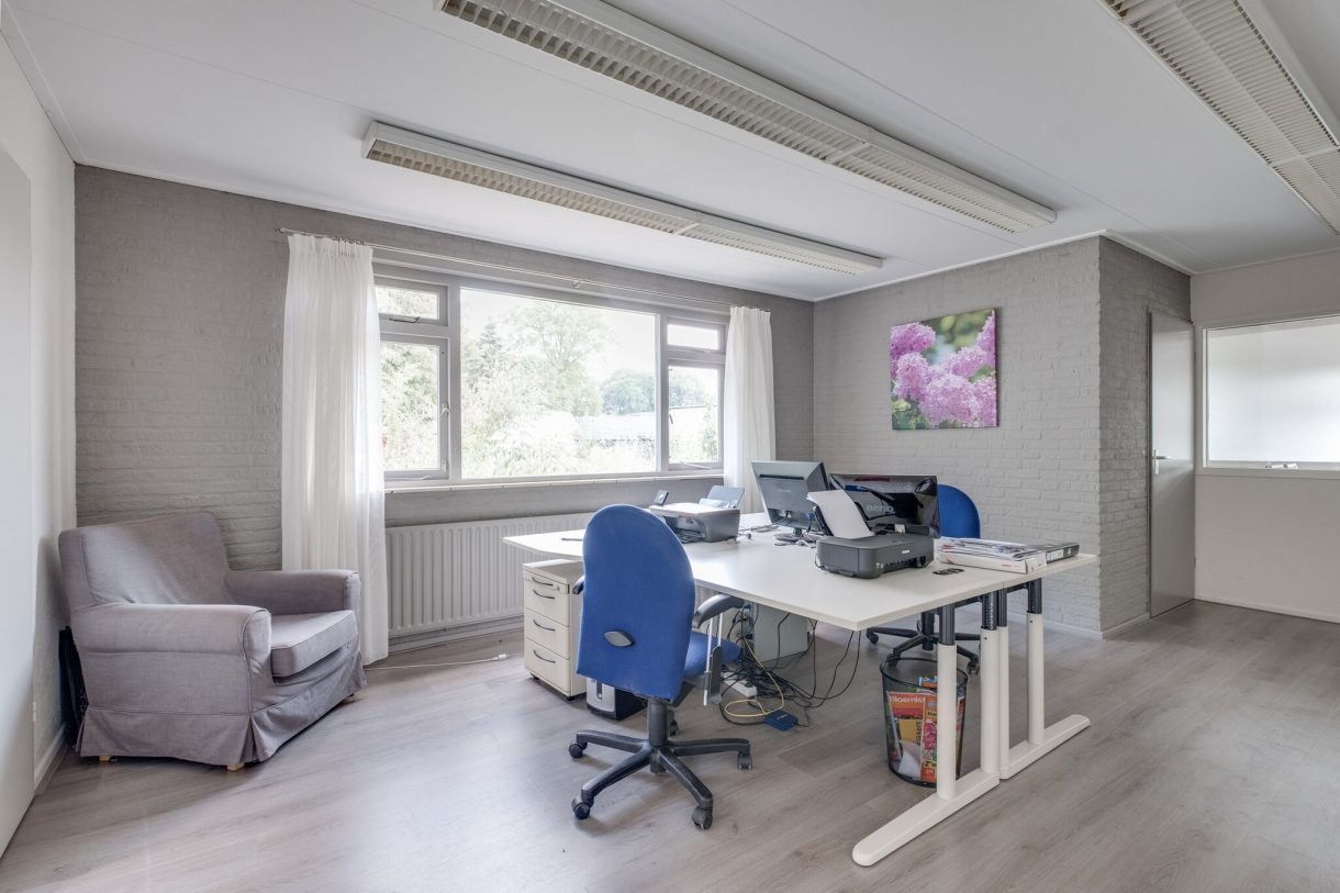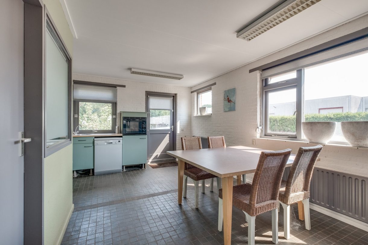 Entree, hal, toiletgroep, spreekkamer, kantoor, kantine met pantry en 2e ingang, kantoor voorzien van kluis, kantoor voorzien van airco.