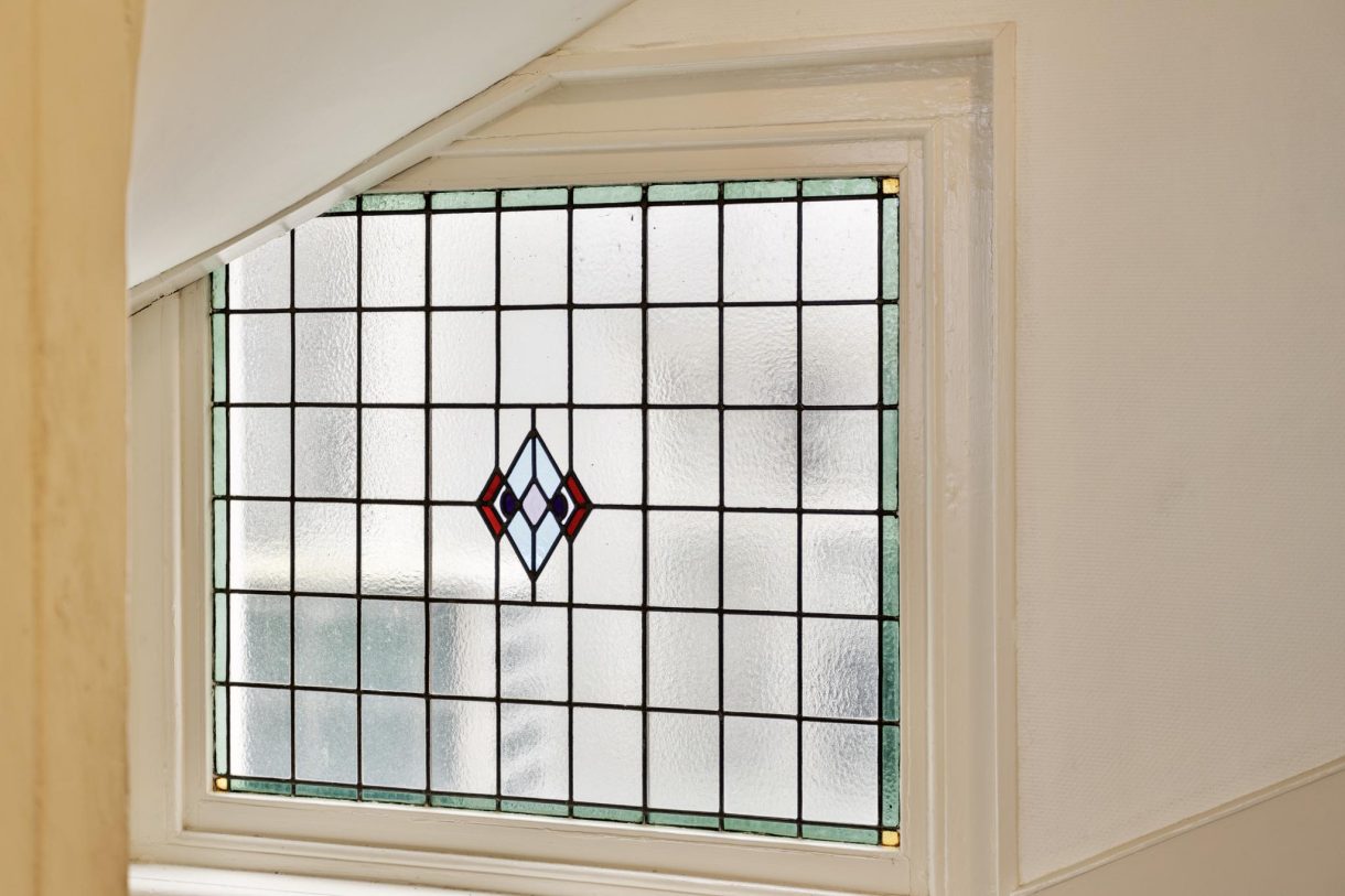 Via de 18e-eeuwse trap is de overloop te bereiken, met een glas in lood venster aan de achterzijde en paneeldeuren met oude deurkozijnen. Aan de voorzijde zijn twee kamers, van elkaar gescheiden met en suite deuren.