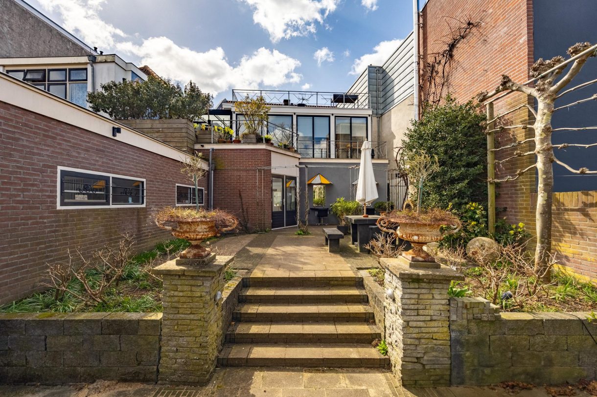 Openslaande deuren geven toegang tot de diepe tuin, die bij mooi weer ook als kapsalon wordt gebruikt. De tuin is fraai aangelegd met sierbestrating en gevarieerde beplanting, waaronder groenblijvende klimop en leibomen aan twee zijden. Er is een achterom naar de achtergelegen Hamersplaats.