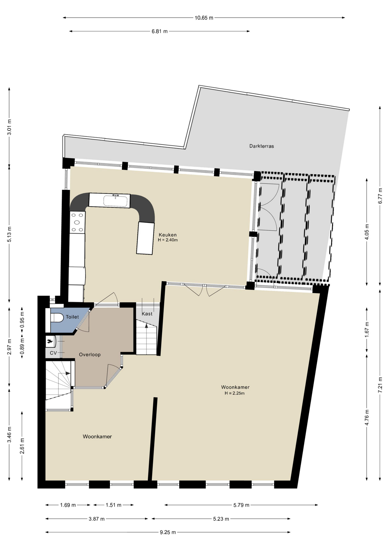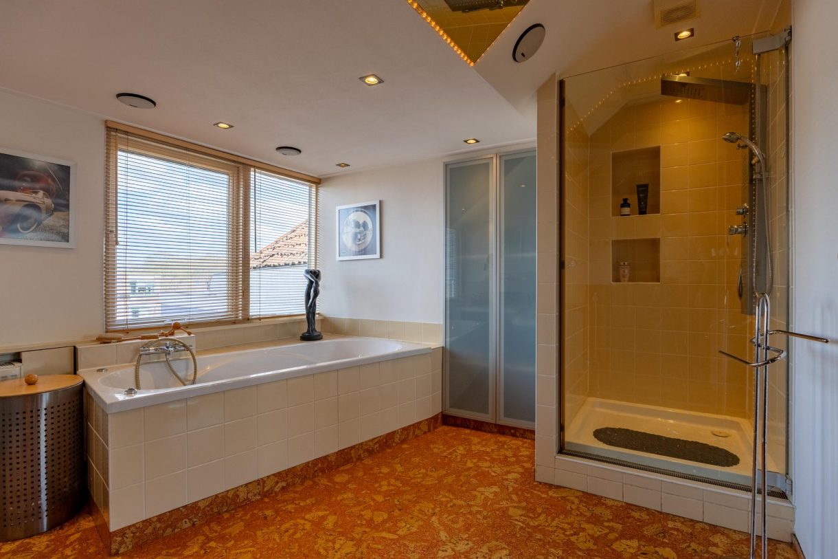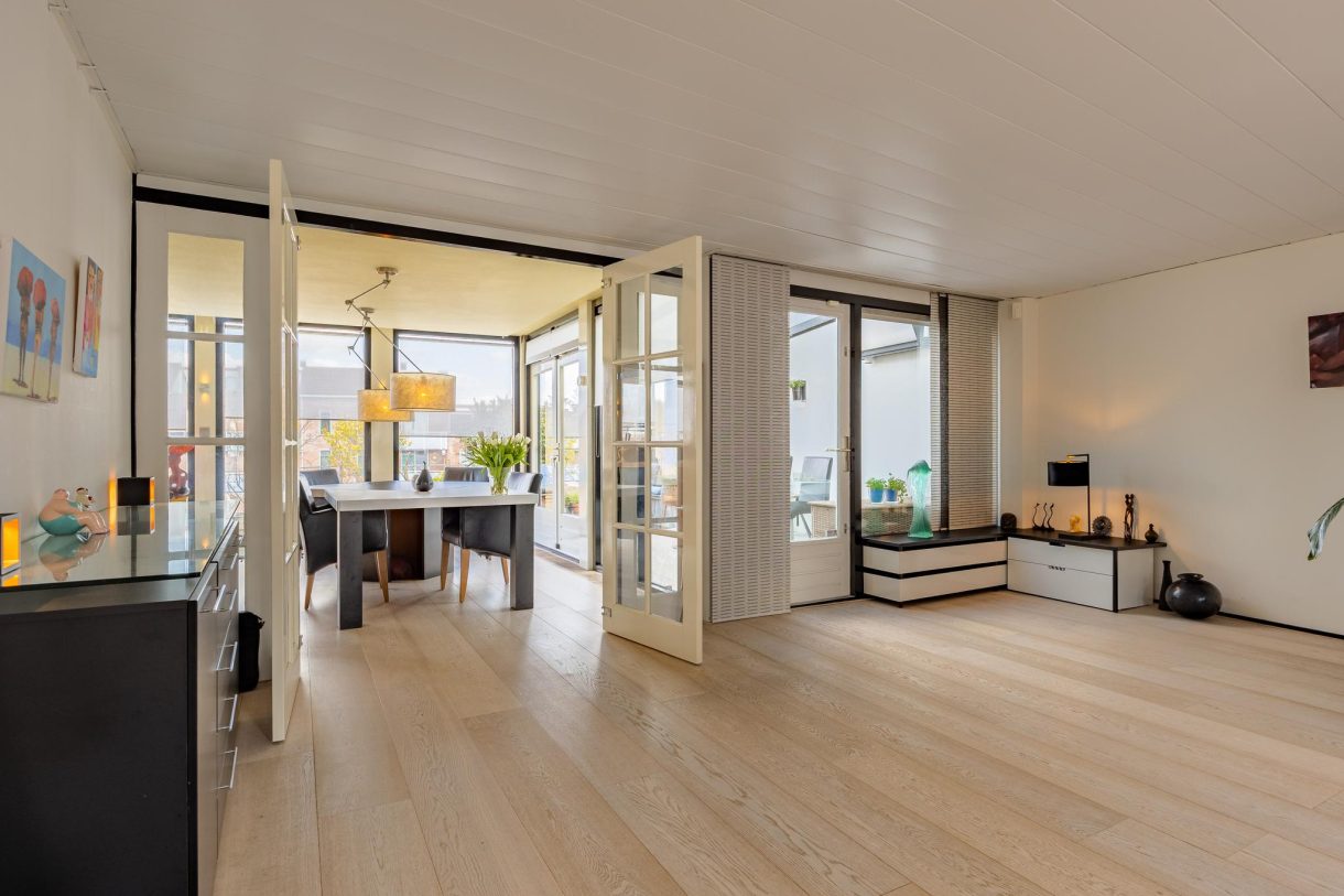 Op de eerste verdieping zijn een lichte overloop met toiletruimte, de zeer ruime woonkamer, een fantastische leefkeuken en het dakterras. De woonkamer, met een breedte van maar liefst 9.25 meter, is verdeeld in een zitkamer en een tv-kamer. Door de grote ramen aan de voorzijde kijk je naar de mooie straat en aan de achterzijde richting de leefkeuken en het dakterras.