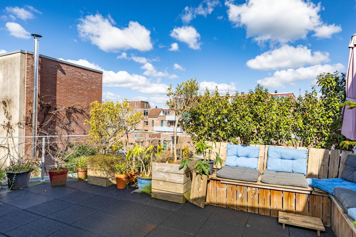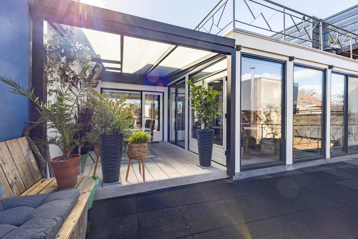 Vanuit de keuken en woonkamer is het royale dakterras te bereiken. Dit is een fantastische plek om buiten te zitten, op de grote maatwerk loungebank of bij de overkapping, waar een tafel met stoelen neergezet kan worden.