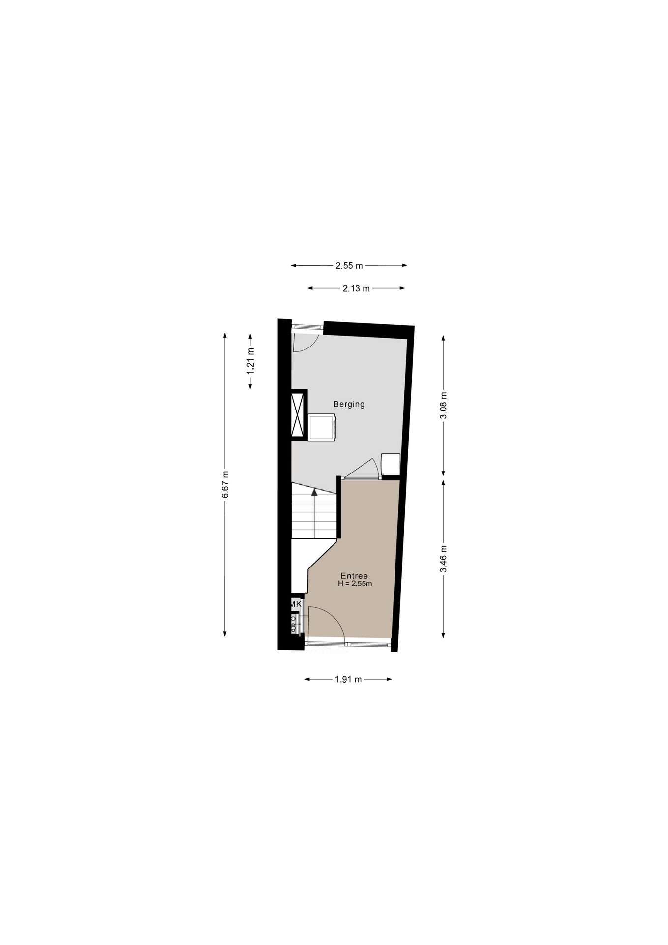 De bovenwoning heeft een eigen entree op de begane grond, die toegang geeft tot een royale hal met meterkast. Vanuit hier is er toegang tot een berging annex wasruimte, met de trap naar de eerste verdieping en een deur naar de tuin.