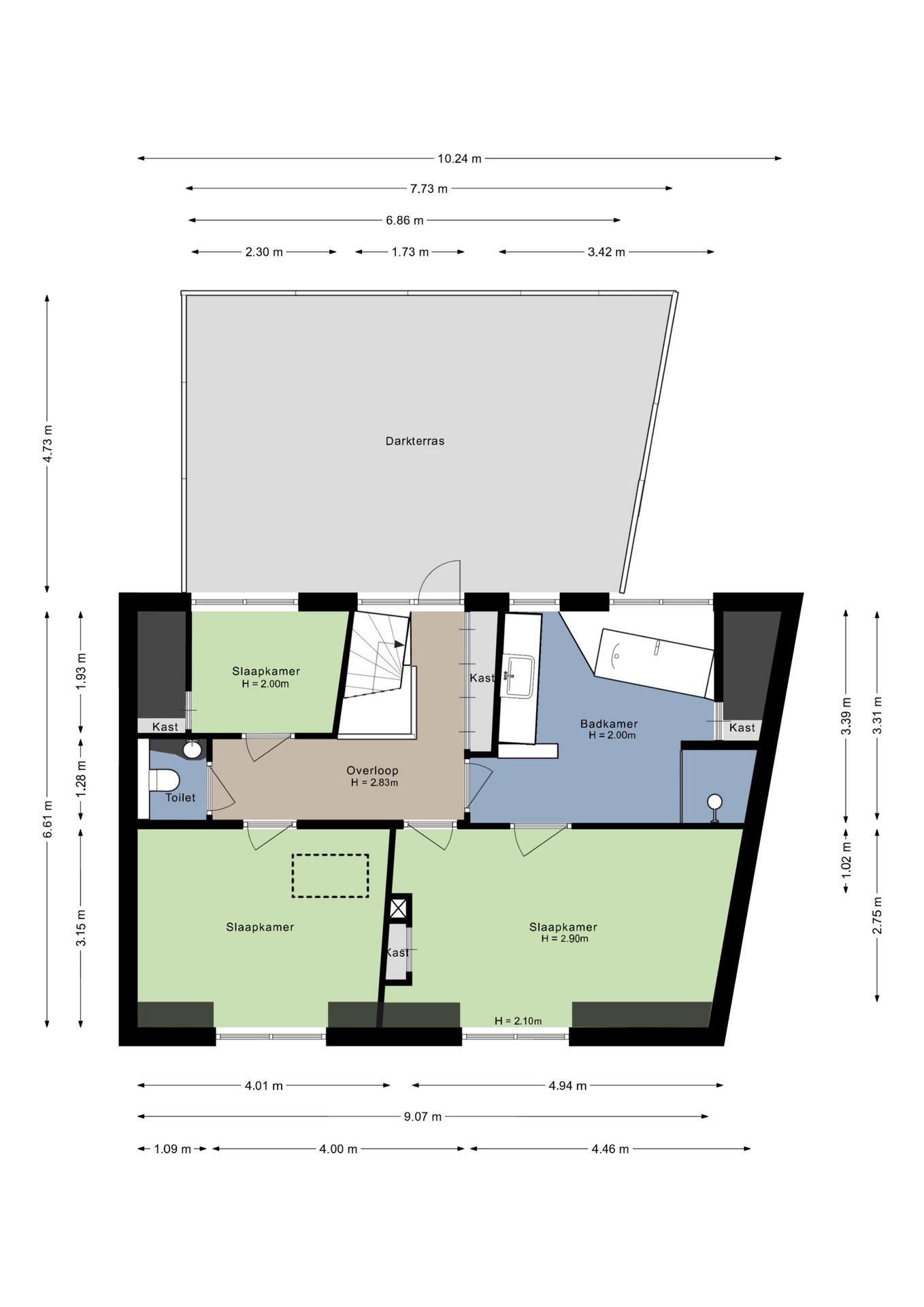 Op deze verdieping zijn drie slaapkamers, de badkamer, een aparte toiletruimte en een tweede dakterras. De twee grootste slaapkamers, beiden met een dakkapel, zijn aan de voorzijde. In de zeer ruime badkamer is de ruimte ingedeeld met een ligbad, luxe douche, inbouwkast en een wastafelmeubel.