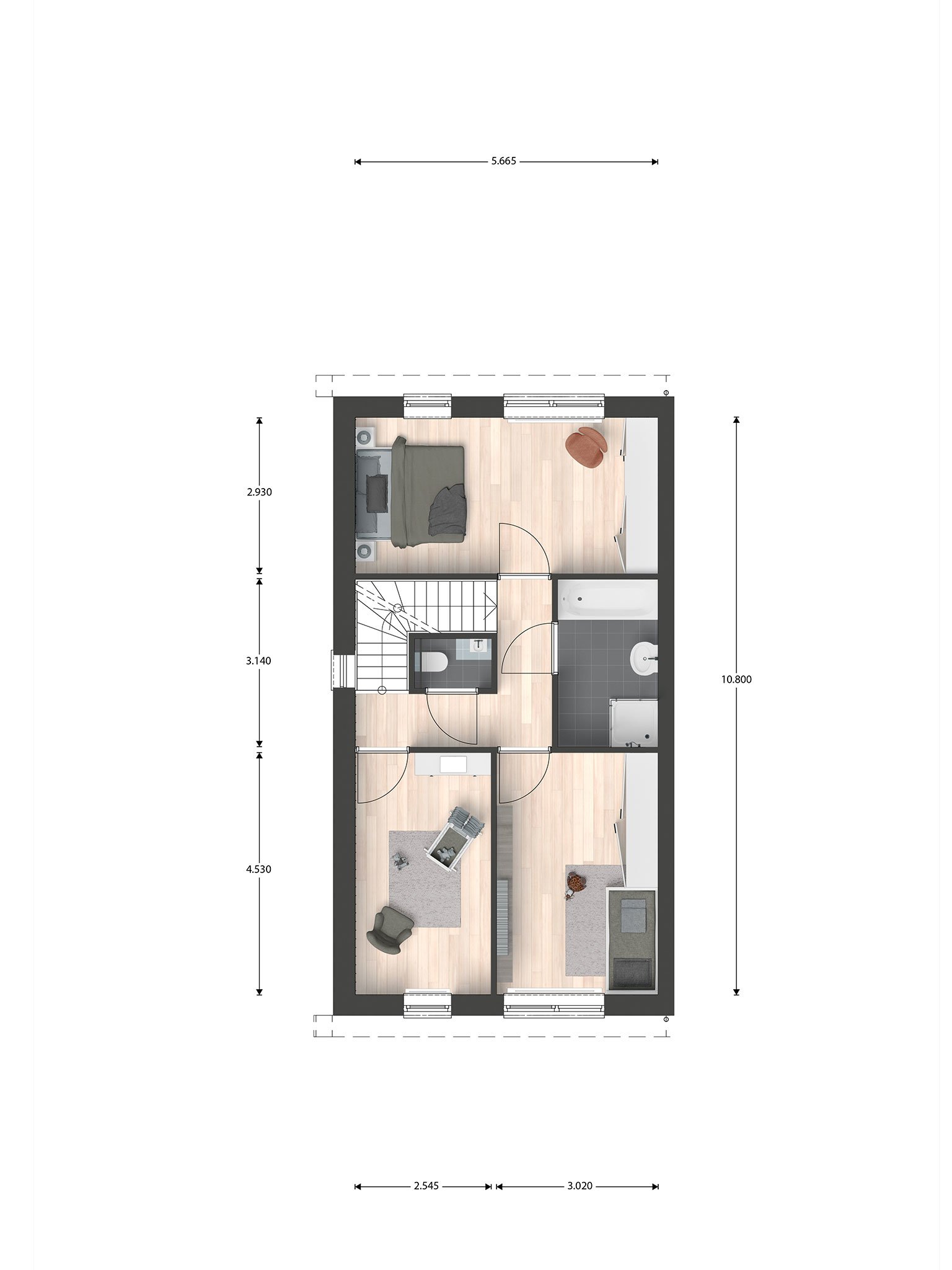 Op de eerste verdieping zijn 3 slaapkamers, de badkamer en een separaat toilet. De zolderverdieping krijgt door de verhoogde voorgevel extra veel licht. Hier maak je nog een 4e slaapkamer als je niet genoeg hebt aan de standaard 3 op de 1e verdieping. Of wat denk je van een rustige werkkamer of speelruimte voor de kinderen? Je kunt met deze woning alle kanten op!