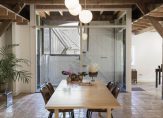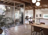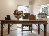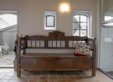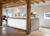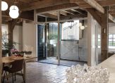 Links van de oprit bevindt zich de deel, die momenteel een zakelijke invulling heeft. Deze karakteristieke ruimte heeft een separate statige entree met aan beide zijden deuren, lichtinval van drie zijden, prachtige authentieke stalramen. De ruimte omarmt u en geeft een fijne sfeer. Een luxe keuken in een vrije opstelling met een prachtig werkblad, rondom voorzien van kastruimte. Natuurlijk een toiletruimte, speciaal voor dit gedeelte. Veelzijdig te gebruiken: als kantoor, praktijkruimte, atelier of trainingsruimte. Ook een invulling om hier gelijkvloers een aanvullende woonruimte of separate woonruimte te creëren is eenvoudig mogelijk. De houten balkenconstructie, travertin natuurstenen vloer geheel voorzien van vloerverwarming, de houtkachel en de balkenplafonds op verschillende hoogten zorgen voor een authentieke, warme uitstraling. Via een prachtig weggewerkte doorgang in de kastenwand bereikt u het voorhuis.