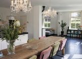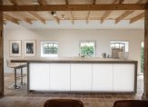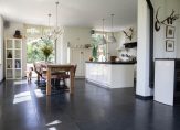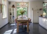 De woon-/eetkamer met open keuken ligt aan de zonnige zijde van de boerderij. De royale ruimte biedt plaats aan een zitgedeelte, een tv-hoek en een eetgedeelte met veel ruimte waar een tafel voor 10 à 12 personen of wellicht meer zeker zijn plek kan hebben. De glas-in-loodramen, de arduin uitgevoerde tegelvloer met vloerverwarming en de pelletkachel gekoppeld aan de cv een staaltje van moderne techniek zijn een warme aanvullende optie op de verwarming van deze ruimte.