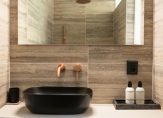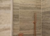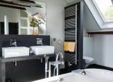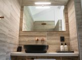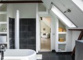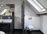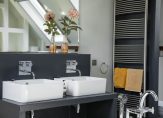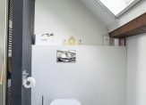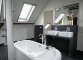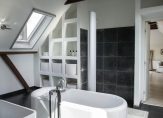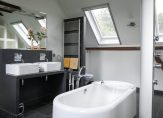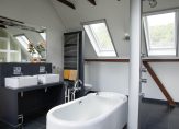 De badkamer, met doorkijk tot in de nok, verbindt de overloop met de master bedroom. Hier kunt u genieten vanuit het ligbad kijkend naar de wolken of de sterren. De badkamer is o.a. voorzien van een ruime inloopdouche met massagestraal, toilet, dubbele wastafelmeubel en een verwarmde spiegel. De natuurstenen vloer is voorzien van elektrische vloerverwarming. Design ten top en laat u hier verrassen door licht en ruimte.
