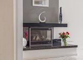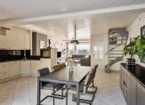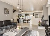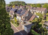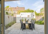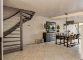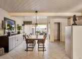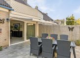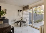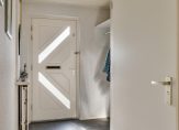 Via de mooie deur met glas loop je de lichte, uitgebouwde woonkamer met halfopen keuken in. Het zitgedeelte bevindt zich aan de voorzijde en het eetgedeelte aan de achterzijde, bij de brede schuifpui naar de tuin. Op een centrale plek in de woonkamer is de grote schouw met inbouwhaard, die samen met de vloerverwarming en de airco-unit (koelen en verwarmen) voor een aangename warmte zorgt.
