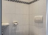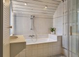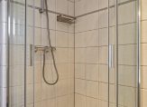 De nette badkamer is ingedeeld met een ligbad, aparte douche, wastafelmeubel en een hoge wandradiator. Het naastgelegen toilet met wandcloset en fonteintje is qua tegelwerk en sanitair in dezelfde stijl uitgevoerd.
