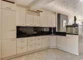 In de open keuken staat een lichte hoekopstelling met een natuursteen blad met achterwand, uitgevoerd in stijlvol zwart. Deze keuken heeft veel bergruimte en de inductie kookplaat, afzuigkap, vaatwasser, oven en koel-/vriescombinatie zijn ingebouwd.