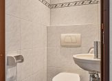 De hal met garderobe en meterkast is een grote ruimte met een keurige afwerking van de muren, het plafond en de vloer. Links in de hal is de toiletruimte, ingedeeld met een wandcloset en een fonteintje.