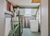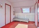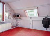 Aansluitend is de vierde slaapkamer met twee dakramen, vaste kast en een grote vloeroppervlakte. Deze slaapkamer heeft, net als de overloop, veel bergruimte in de schuinten van het dak.