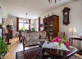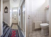 Aan de voorzijde, naast de haag, is de entree van deze charmante woning. In de hal zie je, aan de rechterzijde, de trap naar de eerste verdieping. Ook de trap naar de wijn-/provisiekelder bevindt zich, net als de toiletruimte, in de hal. Maar het allermooiste is de originele granitovloer, een van de typische elementen uit de jaren 30.