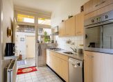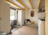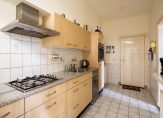 Vanuit de hal, woonkamer en serre is de keuken te bereiken. Hier staat een nette wandopstelling met een gaskookplaat, afzuigkap, combi-oven en een koelkast. Afwassen hoef niet, want onder het aanrechtblad zijn de aansluitingen voor een vaatwasser. Dankzij de serre kun je, vanuit de keuken, overdekt naar de berging lopen. Zo vervult deze ruimte, met een gaskachel, de functie van bijkeuken/wasruimte.