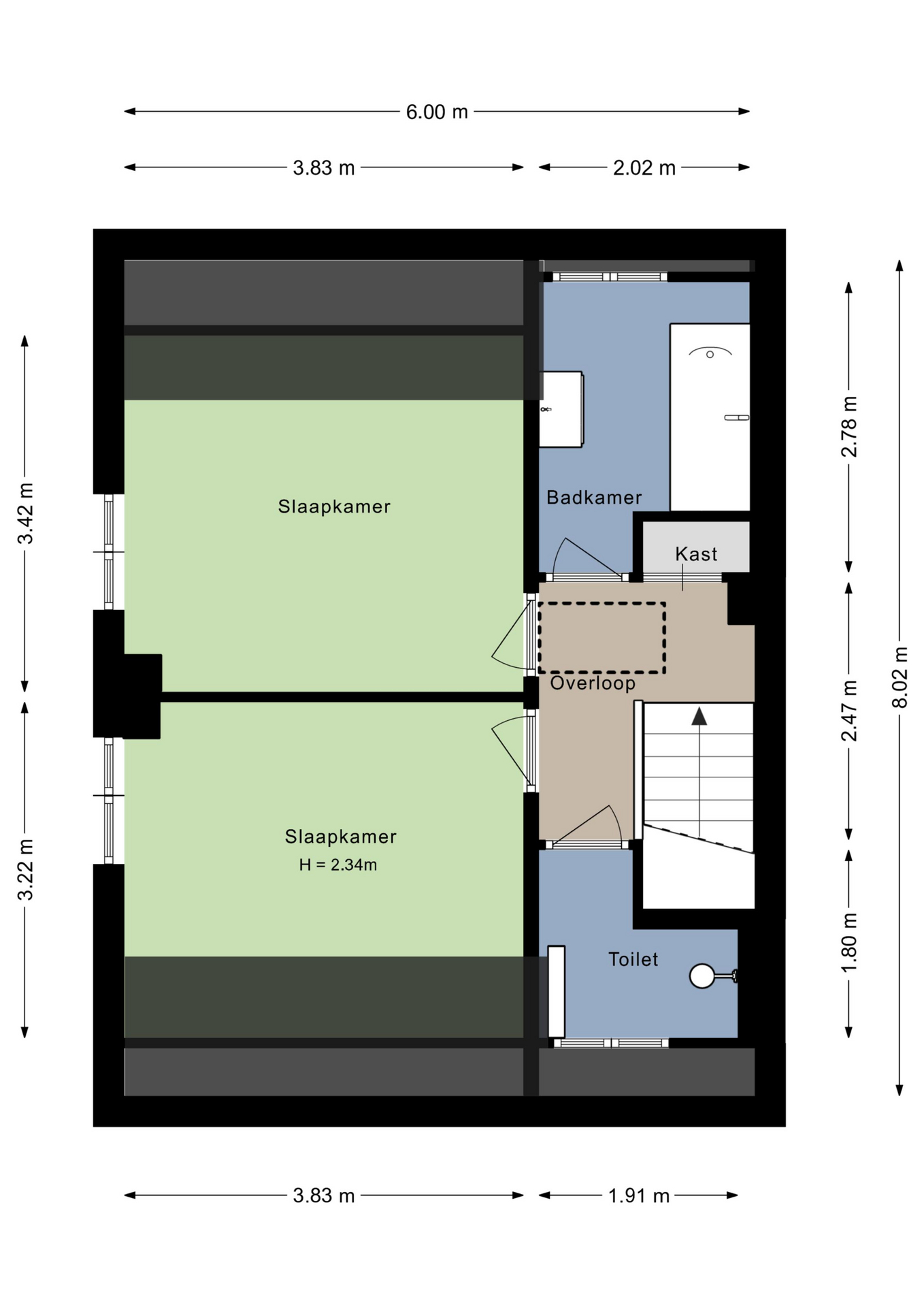 – Twee slaapkamers, een badkamer en een toilet-/doucheruimte op de eerste verdieping;