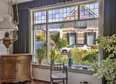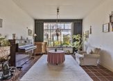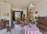 Met een lengte van ruim 8.50 meter en een hoog plafond is de woonkamer een verrassend grote leefruimte, met een schouw als centraal punt tussen het zit- en het eetgedeelte. Aan de voorzijde zijn, net als in de hal, de originele bovenramen behouden en de plavuizen vloer is kenmerkend voor de periode waarin de woning is verbouwd.