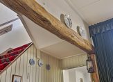 De hal bestaat uit twee delen, waarbij het achterste deel in open verbinding met de woonkamer staat. Dikke eikenhouten balken markeren de plek waar vroeger een muur heeft gestaan en op de plek van de kapstok was vroeger de toegang tot de woonkamer. In de hal en op de trap ligt een klassieke, kleurrijke loper.