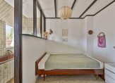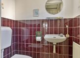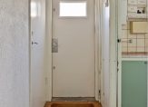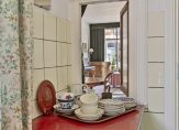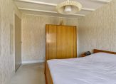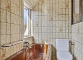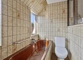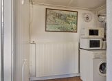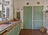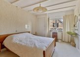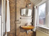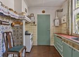 Bij het eetgedeelte zie je een handige inbouwkast en een doorgang naar de keuken, die goed weergeeft wat de keukentrend in de jaren 60 was. Aan de kant van het raam staat een wandopstelling met een broodplank en het doorgeefluik naar de woonkamer. Aan de andere kant zie je een schouw en een kastenwand. In het verlengde van de keuken is de verwarmde bijkeuken/berging met de toiletruimte, bergzolder en een dubbele toegang tot de tuin.