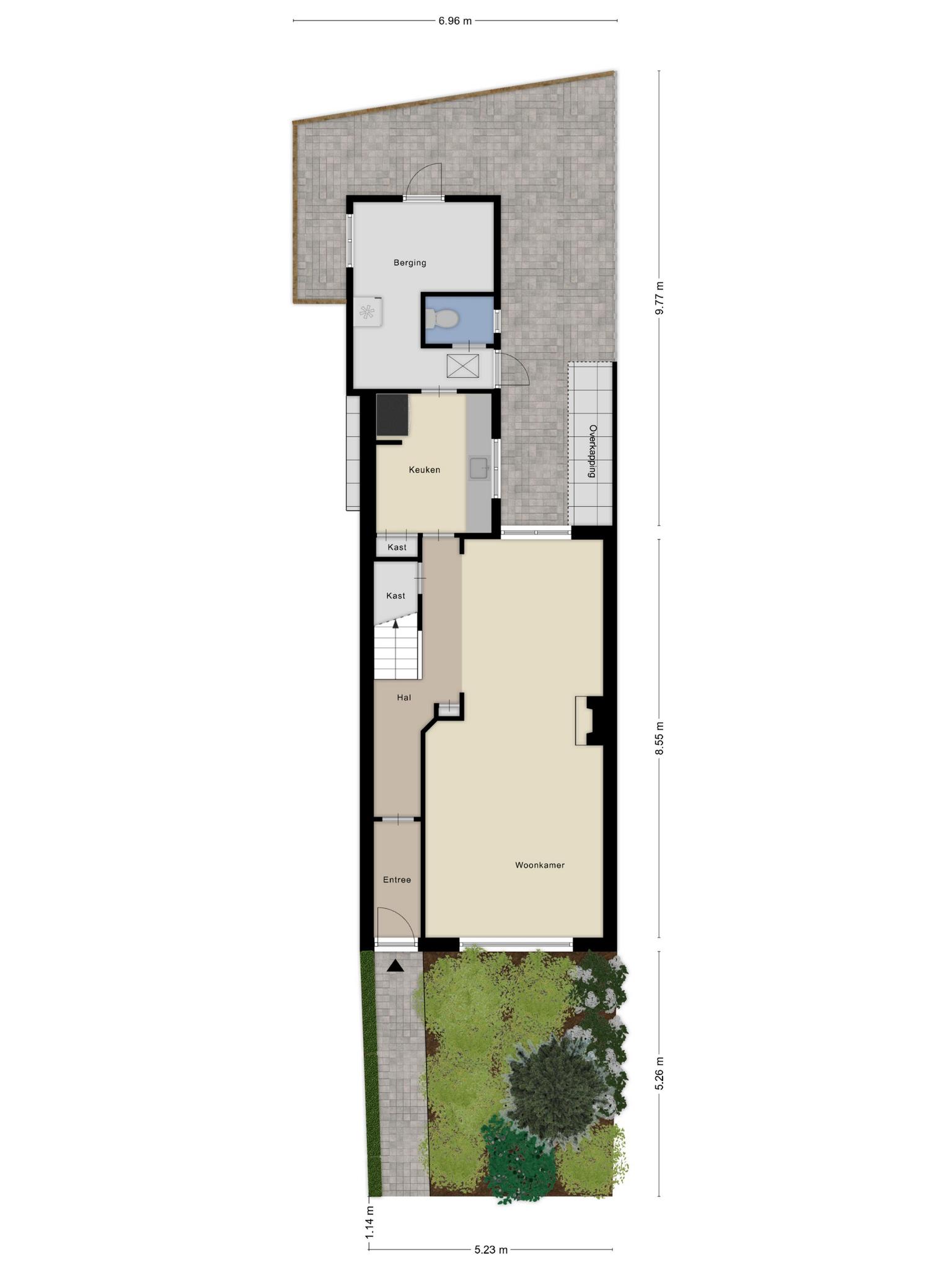 Deze woning heeft een diepe voortuin met veel groen en een onderhoudsvriendelijke achtertuin met terras. Met een ligging op het westen zit je in de achtertuin tot laat in de zon. Het achterste deel van het perceel is de steeg, met de mogelijkheid om een schutting of een andere erfafscheiding neer te zetten.