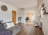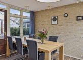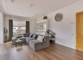 De woonkamer met erker en de aangebouwde eetkamer vormen samen een leefruimte van goed formaat. In de bijna 6.50 meter brede woonkamer trekt het plafond met sierlijsten de aandacht en in het plafond van de eetkamer is een ronde lichtkoepel geplaatst. Vanuit de eetkamer is de achtertuin te bereiken.