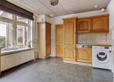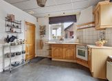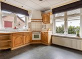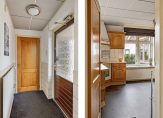 Via een van de paneeldeuren loop je de ruime keuken in, met grote ramen aan twee zijden. De eikenhouten opstelling met afzuigschouw is voorzien van een keramische kookplaat, afzuigkap, oven, koelkast en een vaatwasser. In de hoek van de keuken is een deur naar de tweede entree met inbouwkast. Deze entree bevindt zich aan de achterzijde van de woning.