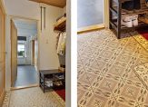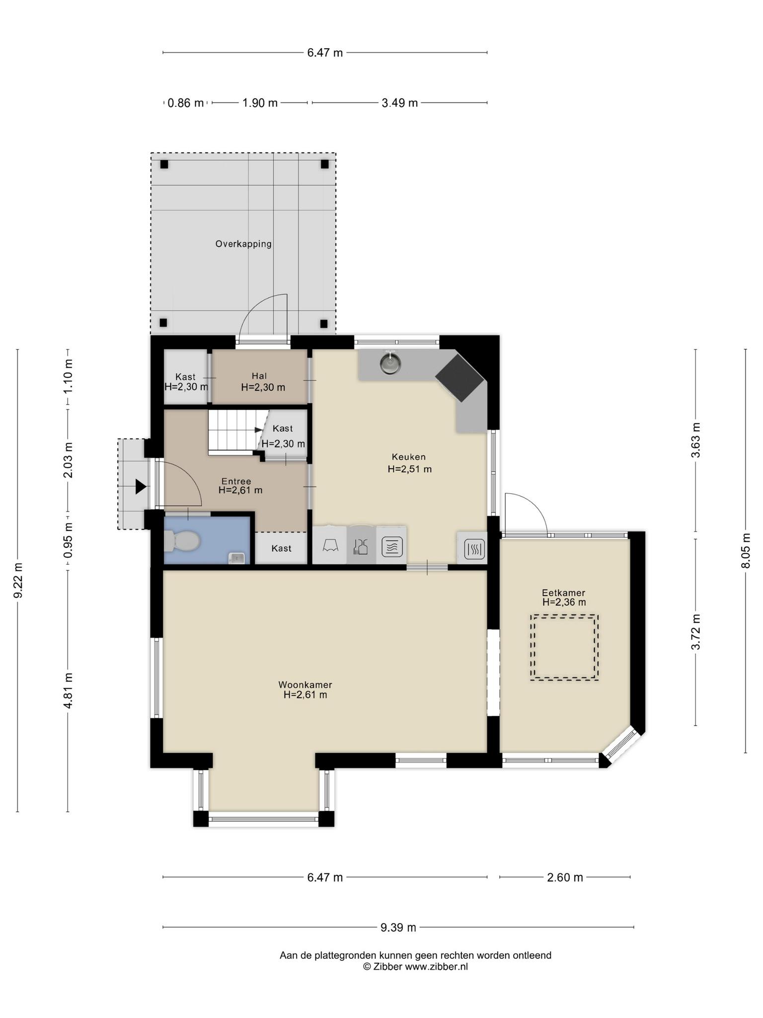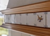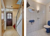 Aan de linkerzijde van de woning is de overdekte entree, te herkennen aan de gele tegels bij het stoepje. In de hal zie je direct de klassieke stijl van het huis, met een mooie trapopgang en een stijlvolle tegelvloer. Rechts in de hal zijn de toiletruimte met fonteintje en de garderobenis.