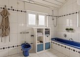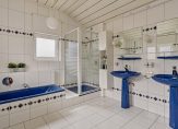 De badkamer is een heerlijk grote ruimte met witte wand- en vloertegels, ramen aan twee zijden en blauw sanitair. Je hebt de beschikking over een ligbad, aparte douche, bidet en twee wastafels op een zuil. In de separate toiletruimte met fonteintje zie je dezelfde stijl.