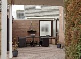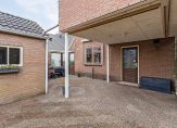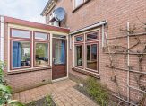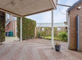 Vanuit de eetkamer en de hal aan de achterzijde is de besloten achtertuin met overdekt terras te bereiken. Er is een eigen achterom en de hoge haag zorgt, net als de houten schutting, voor privacy.