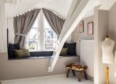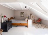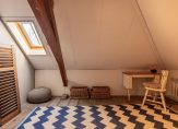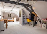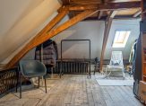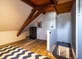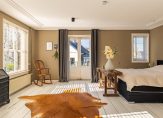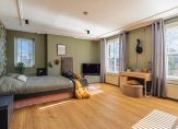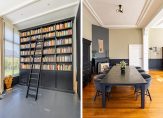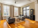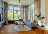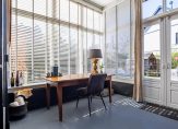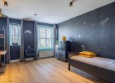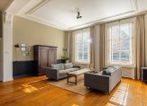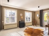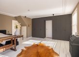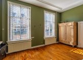 Op de eerste verdieping bevinden zich drie zeer ruime slaapkamers, waaronder de master bedroom met openslaande deuren naar een zonnig dakterras op het zuidwesten. De kamers zijn voorzien van brede houten vloeren, hoge stijlplafonds en paneeldeuren die de historische charme behouden.