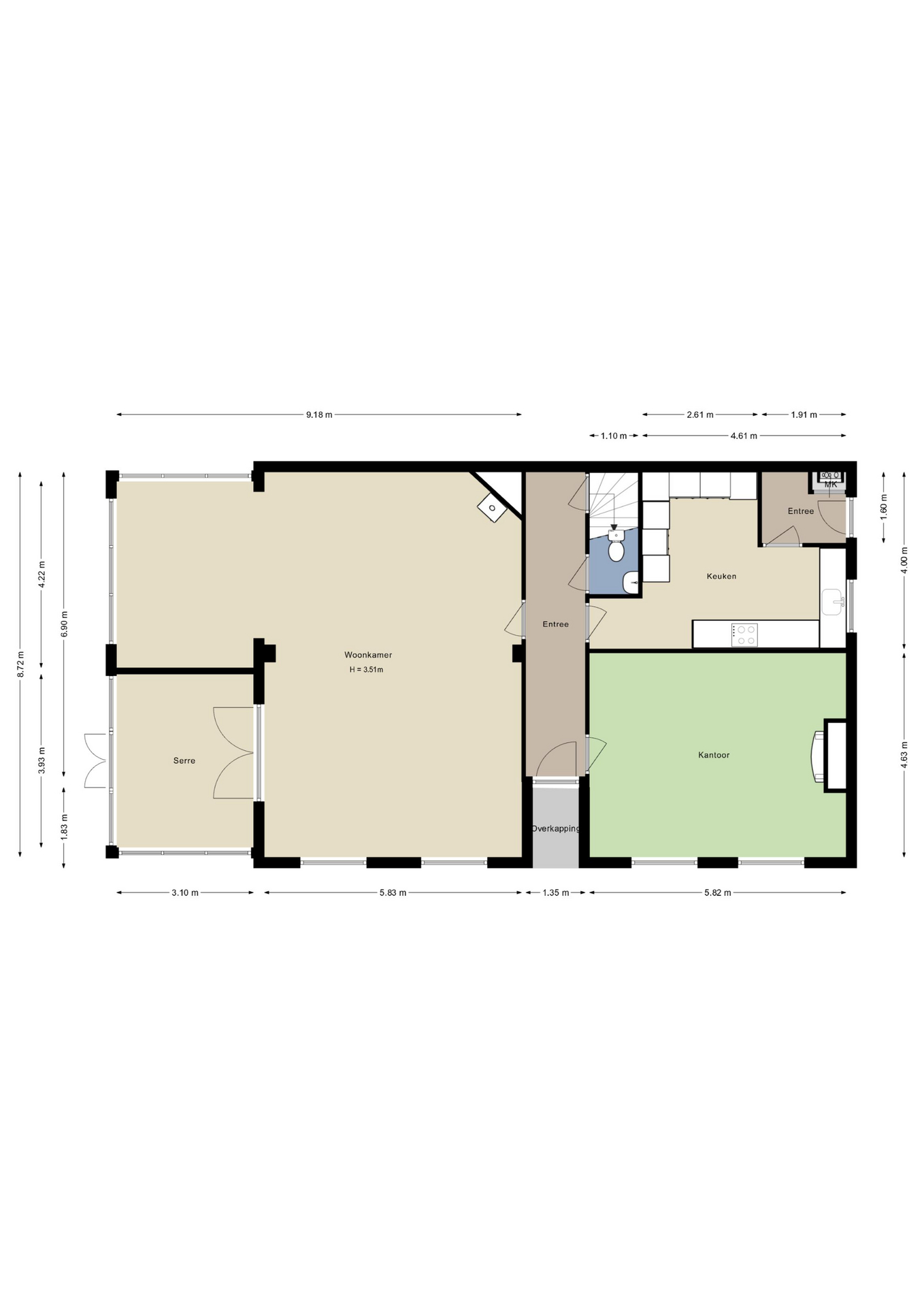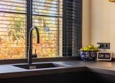 Aan de andere zijde van de hal bevindt zich een royale kantoorruimte met open haard. De ruimte is licht en sfeervol, met hoogwaardige materialen en verfijnde kleuren. De keuken, een exclusieve matzwarte keukenopstelling (2021), is voorzien van een hoge kastenwand, hoekopstelling en alle benodigde inbouwapparatuur van topkwaliteit. De keuken heeft een eigen entree, ideaal voor praktische toegang tot huis en tuin.