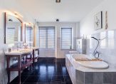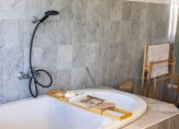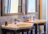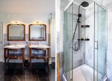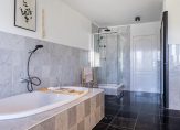 De badkamer is een perfecte mix van stijl en comfort: hardsteen en marmer vormen de basis, gecombineerd met elegant sanitair en moderne accenten zoals zwarte kranen. Een plek waar design en functionaliteit elkaar ontmoeten.