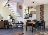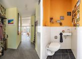 De hal, met een donkere tegelvloer en fraai behang op de muur, is een goed begin van je kennismaking met deze woning. Naast de meterkast is plek voor een kapstok en een schoenenrek, en aan de andere kant van de hal is een kast met de warmtepomp. Verder zijn hier de trap naar de eerste verdieping en de kleurrijke toiletruimte, met een wandcloset en een fonteintje.