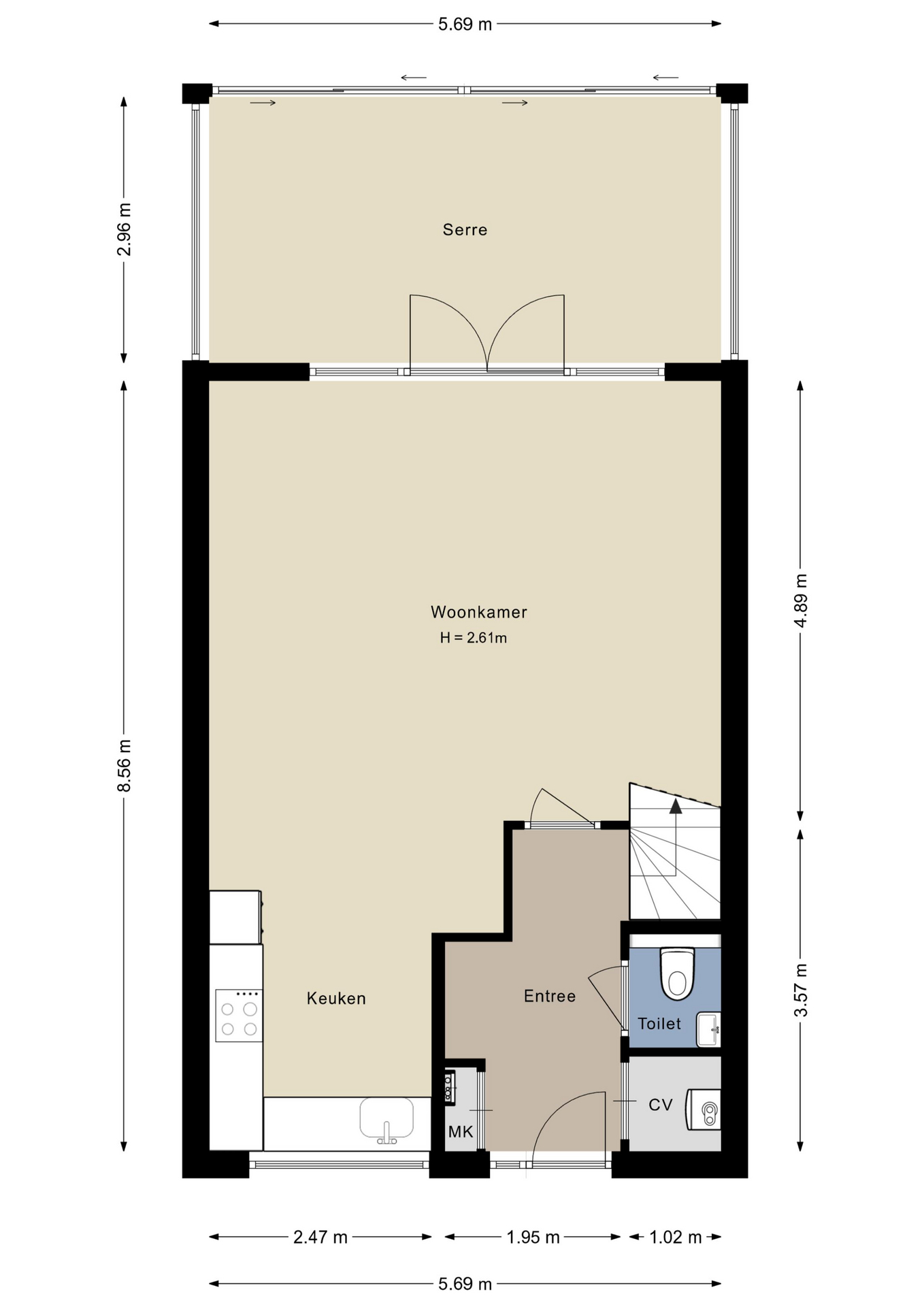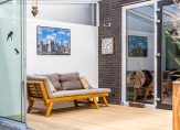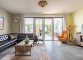 In de woonkamer en open keuken ligt dezelfde vloer als in de hal, met heerlijke vloerverwarming. Met een breedte van bijna 5.70 meter is er genoeg plek voor een grote zithoek, tv-meubel en de eettafel. De ruimte onder de trap is open, waardoor de woonkamer heel ruimtelijk oogt. In 2018 is de tuinkamer/serre aangebouwd, met een glazen schuifwand aan de tuinzijde. Zo is de leefruimte fors vergroot, want van deze ruimte is een geliefde plek bij de huidige bewoners.