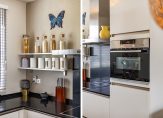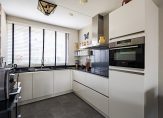Vlak naast het eetgedeelte is de keuken, waar een lichte hoekopstelling met een composiet blad staat. Niet alleen het aanrechtblad, maar ook de achterwand bij het kookgedeelte is van composiet en alle benodigde apparatuur is ingebouwd: een inductie kookplaat, afzuigkap, vaatwasser, combi-oven en een koelkast. Er is genoeg ruimte om een losse servieskast of, zoals nu, een ladekast in de keuken te zetten.