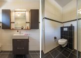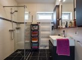 De badkamer, uitgevoerd in tijdloos wit en zwart, heeft lichtinval via het raam in de voorgevel. Je oog valt op de ruime inloopdouche met glazen wand, en verder zijn er een toilet, handdoekenradiator en een wastafelmeubel. De lades bieden, net als de kasten aan weerszijden van de spiegel, genoeg ruimte om spullen op te bergen.