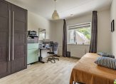 Vanaf de overloop zijn drie slaapkamers te bereiken, waarvan twee aan de achterzijde. Deze kamers zijn nu in gebruik als hobbyruimte en als werk-/logeerkamer. De master bedroom, met een frisse kleur op de muren, is aan de voorzijde. In alle slaapkamers en op de overloop ligt een pvc-vloer.