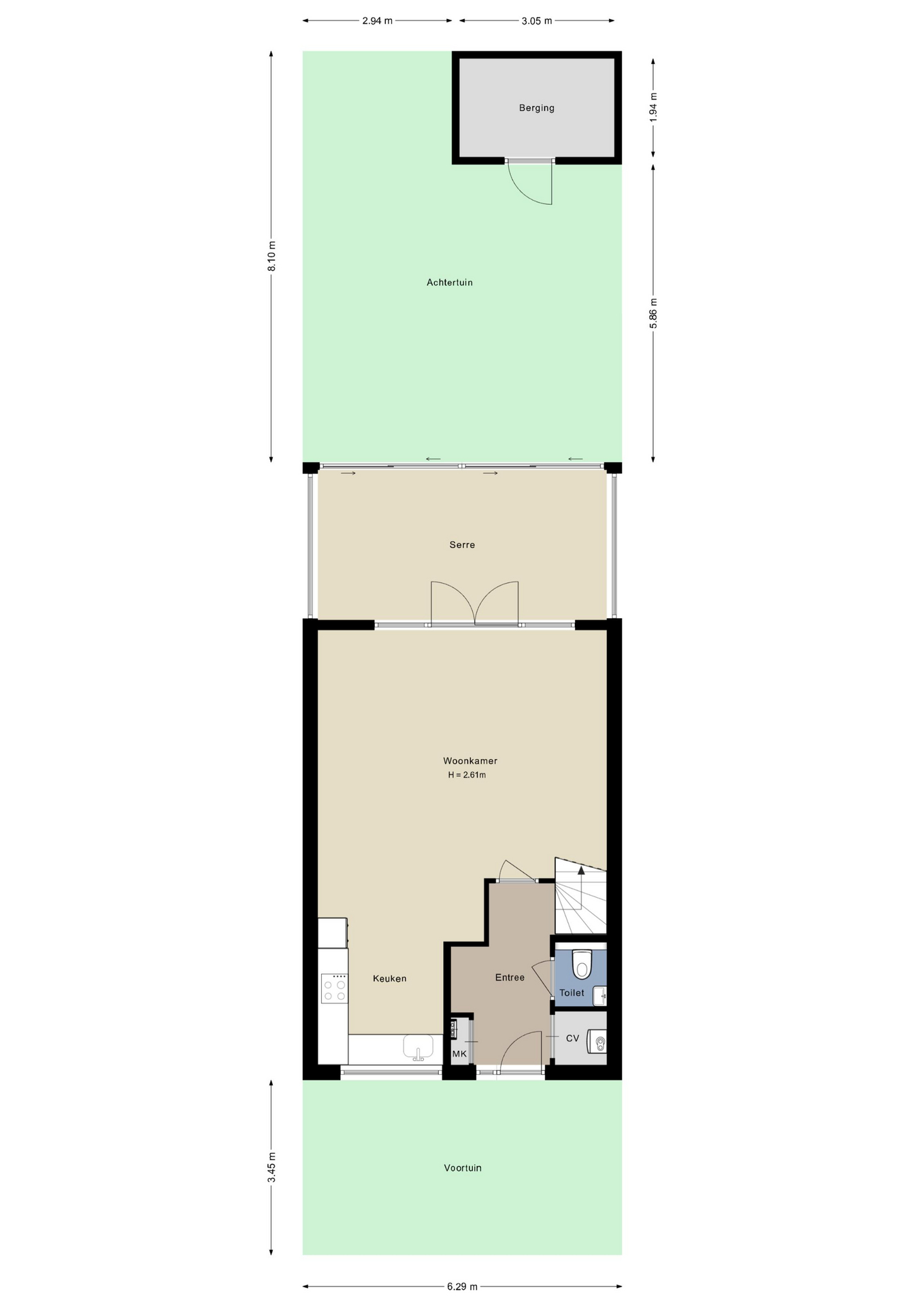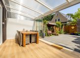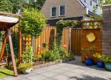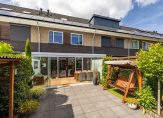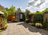 Vanuit de tuinkamer/serre loop je de achtertuin in, gesitueerd op het oosten. Je ziet bestrating, mooie schuttingen en mooi aangelegde borders met beplanting. Er is genoeg plek om in de zon te zitten, en de berging biedt ruimte voor de fiets(en). Een achterom is er ook, want in de hoek van de tuin is een poort naar de steeg. Tenslotte de voortuin, met een lage haag en gevarieerde beplanting… is het geen plaatje?