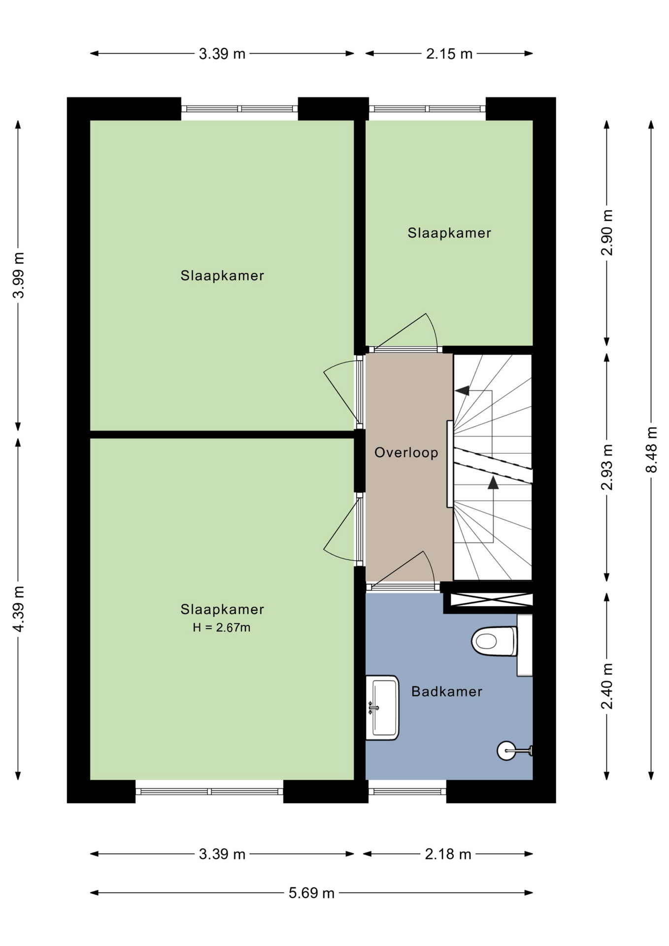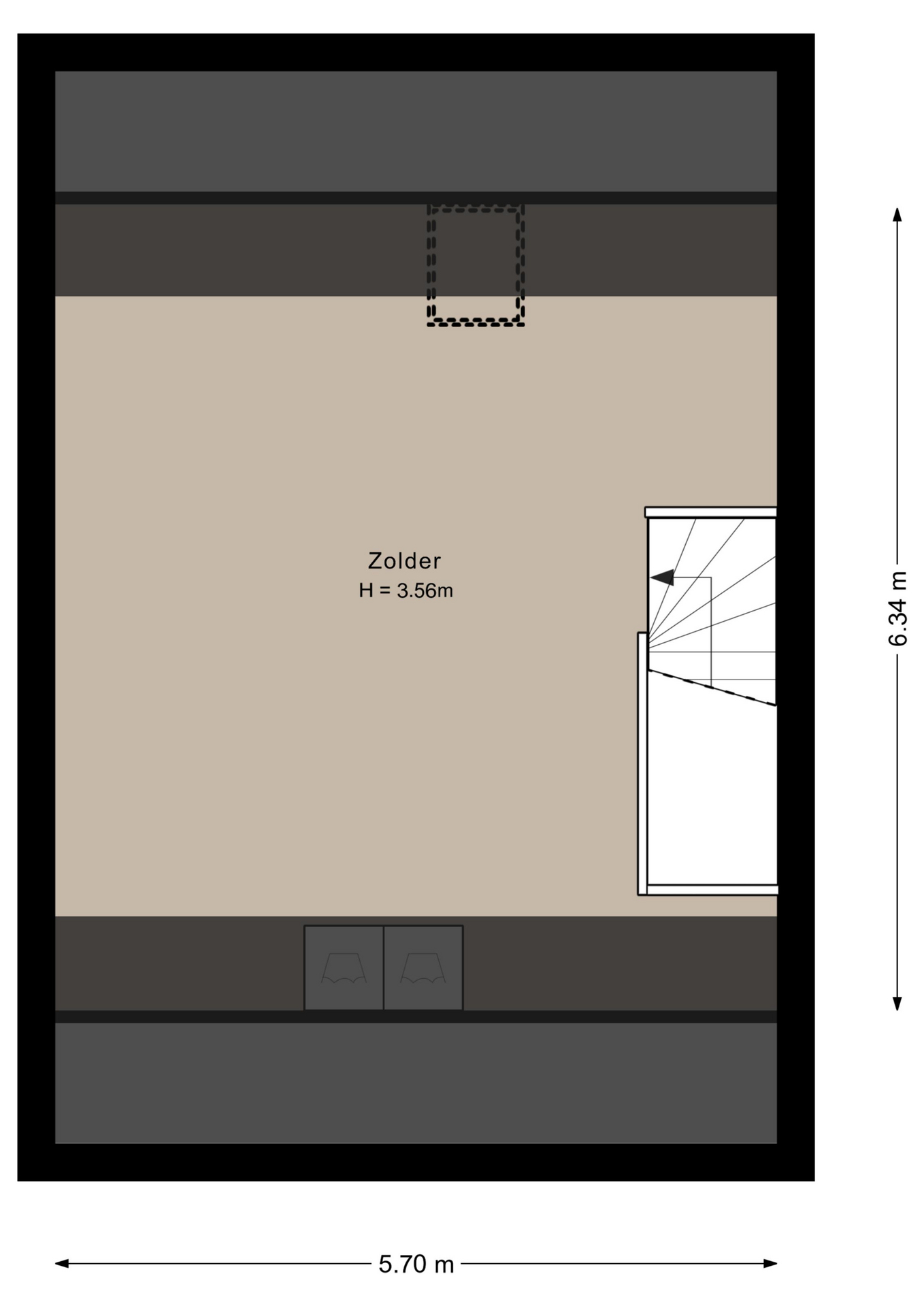 – Vaste trap naar de tweede verdieping (mogelijk slaapkamer/werkkamer);