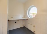 In de keuken zie je een schuifdeur, die toegang geeft tot de bijkeuken/wasruimte. Onder het blad is ruimte voor de wasapparatuur en het ronde raam zorgt ervoor dat de ruimte heel licht is.