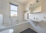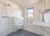 De badkamer is in dezelfde kleurstelling als de toiletruimte, met witte wandtegels en grijze tegels op de vloer. Bij het raam is het ligbad en verder zijn er een inloopdouche, een toilet en een wastafel met spiegelkast.