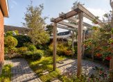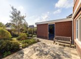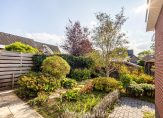 Vanuit de woonkamer en de garage is de mooi aangelegde tuin op het zuiden te bereiken. Er zijn twee terrassen, waarvan een met een pergola, en er is veel groen in de tuin. Je ziet bomen, struiken en planten in mooie kleuren, wat de tuin tot een gezellige plek maakt. Naast de garage is een eigen achterom en ook de voortuin is heel groen, met twee bomen die ervoor zorgen dat er geen inkijk in de keuken is.