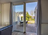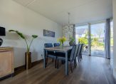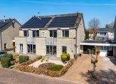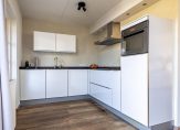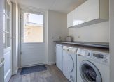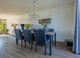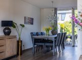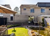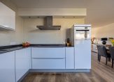 De L-vormige woonkamer staat in open verbinding met de moderne, open keuken. Het eetgedeelte, bij de schuifpui naar de tuin, biedt ruimte aan een grote eettafel en het zitgedeelte is aan de voorzijde, over de hele breedte van het huis. In de keuken staat een lichte hoekopstelling met een inductie kookplaat, afzuigkap, vaatwasser, kokend waterkraan, combi-oven en een koelkast. Erg handig is de bijkeuken, met vaste kasten en een lang aanrechtblad. Onder het blad is ruimte voor de wasmachine, droger en een vriezer.