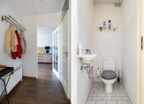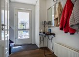 Aan het einde van de oprit, waar twee auto’s kunnen staan, is de entree van deze heerlijk ruime woning. In de hal, naast de meterkast, is de garderobe en aan de andere zijde zijn de trapopgang en toiletruimte. De houten vloer en de binnendeuren zorgen voor een hal met een huiselijke sfeer.