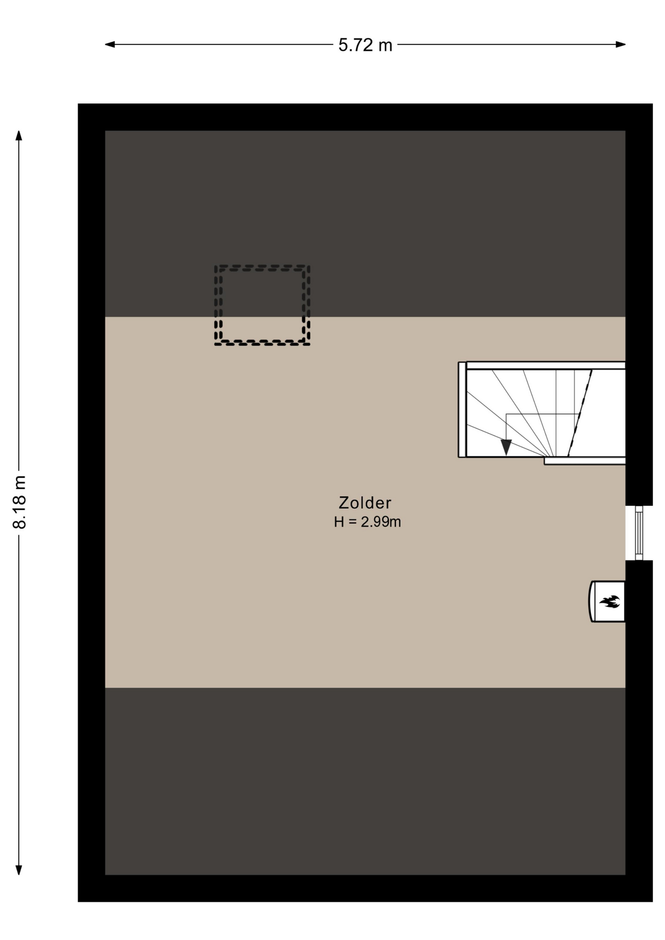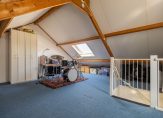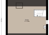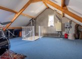 Een vaste trap geeft toegang tot een zeer royale zolderkamer, met een hoge nok en een dakraam aan de achterzijde. Het dak is geisoleerd en ook op deze verdieping is de vloer van beton. Het is mogelijk om hier twee extra slaapkamers, een berging en een wasruimte te creëren. Naast het zijraam is de opstelling van de HR-ketel en omvormer van de zonnepanelen.