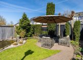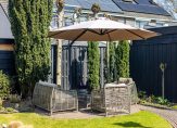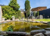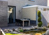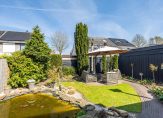 Vanuit de woonkamer en bijkeuken is de achtertuin te bereiken, die zowel zon als schaduw biedt. Er zijn twee terrassen gemaakt en verder zie je een grote vijver, een gazon en diverse beplanting. Wat een sfeer heeft deze tuin, dus laat het mooie weer maar komen!