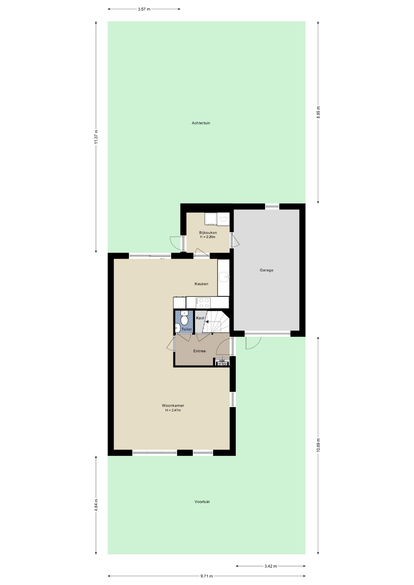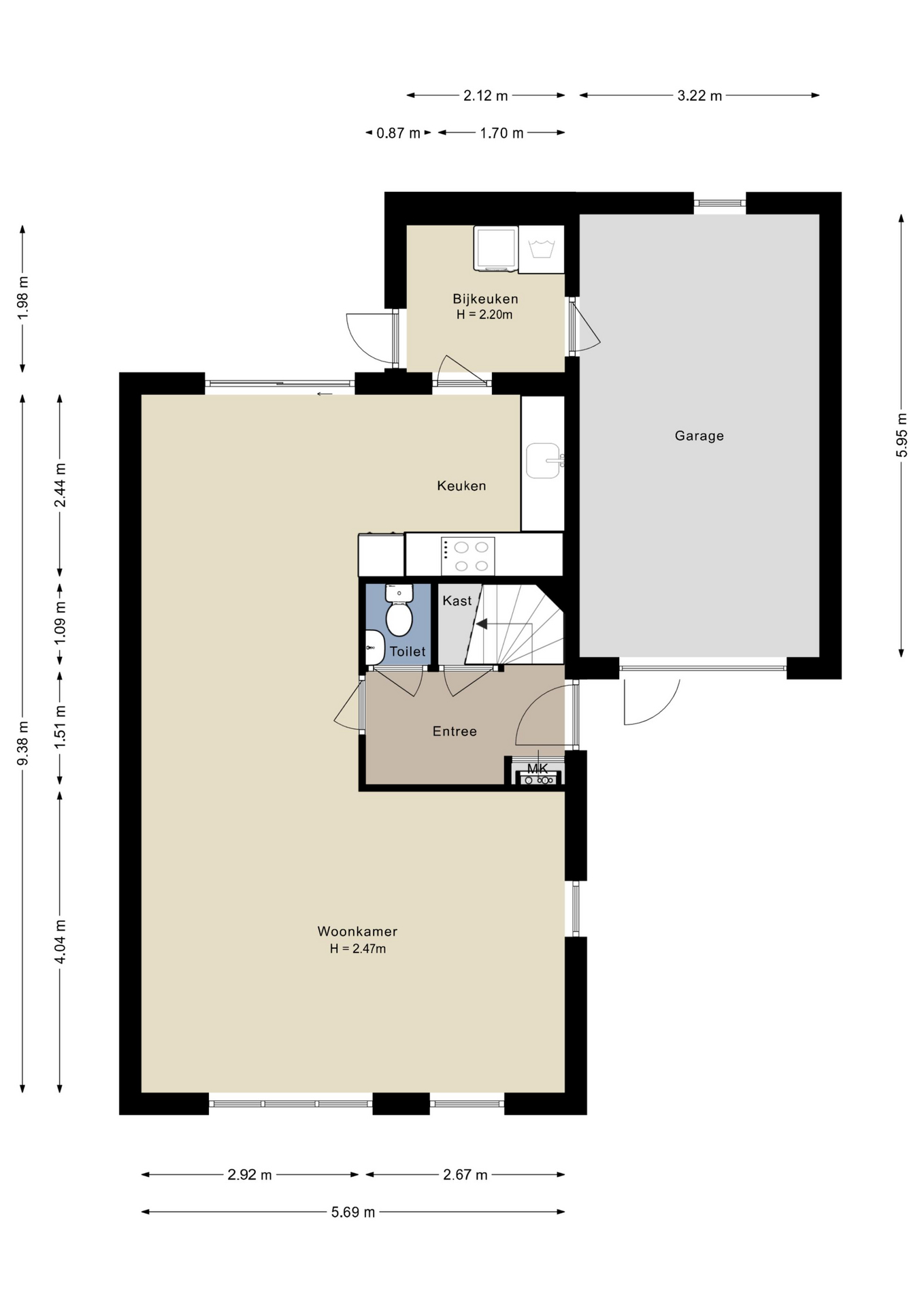 Vanuit de bijkeuken zijn de tuin en de aangebouwde garage te bereiken. De breedte, binnen gemeten, is 3.22 meter en de lengte is bijna 6 meter. Zo is er genoeg plek voor de auto, fietsen en het tuin-/klusgereedschap.